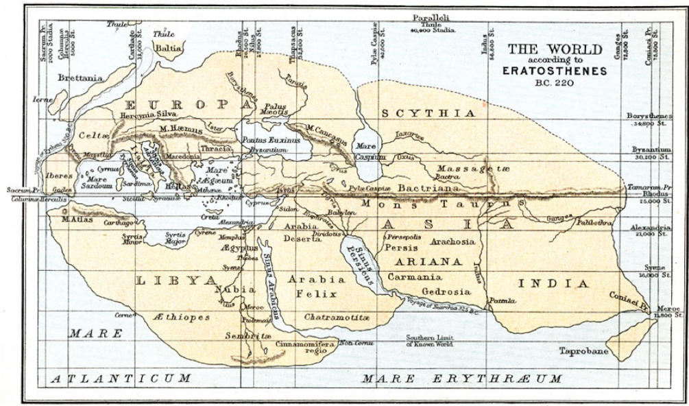 Tuttavia già in antichità i filosofi greci giunsero a teorizzare la Terra come sferica, fino ad arrivare ad Eratostene di Cirene, che nel III secolo a.e.v. misurò la circonferenza del pianeta con soli 700 km di scarto rispetto a quella reale di 40.077 km, misurazione che resto la più precisa fino al 1670, quando il calcolo dell’arco di grado permise inoltre ai geografi francesi di determinare l’entità dello schiacciamento ai poli.