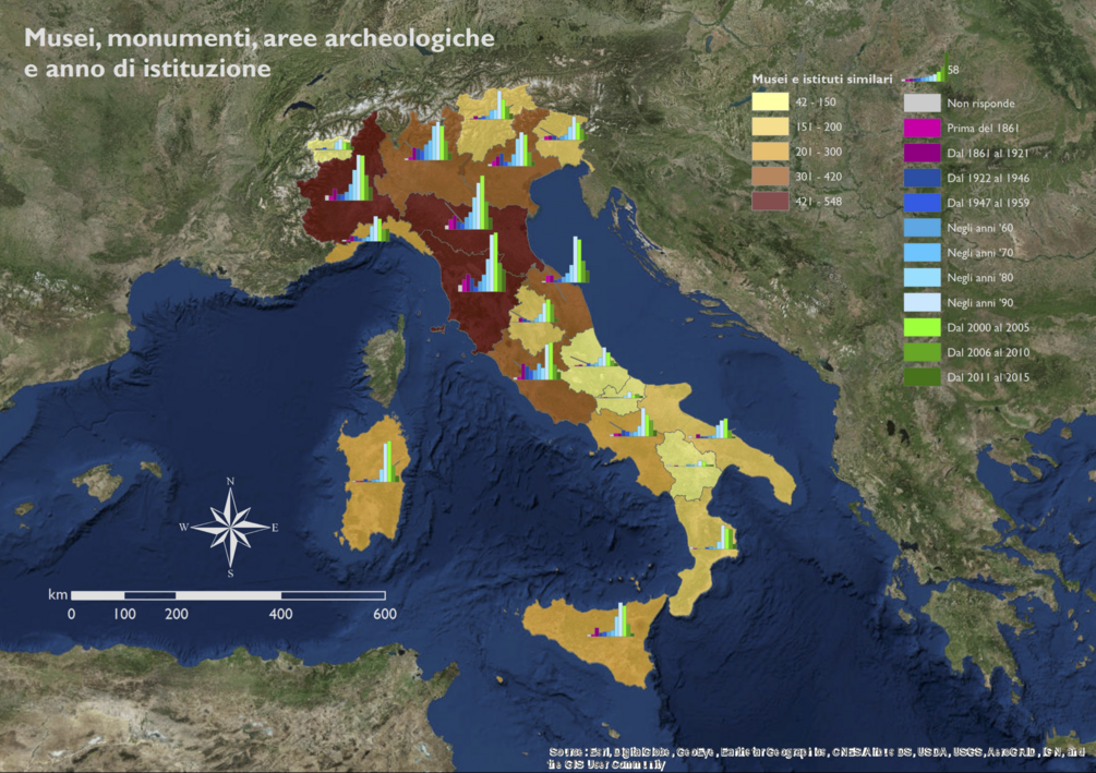 Si presenta un cartogramma relativo al numero di musei archeologici in relazione all’anno di istituzione degli stessi, suddivisi per regione.